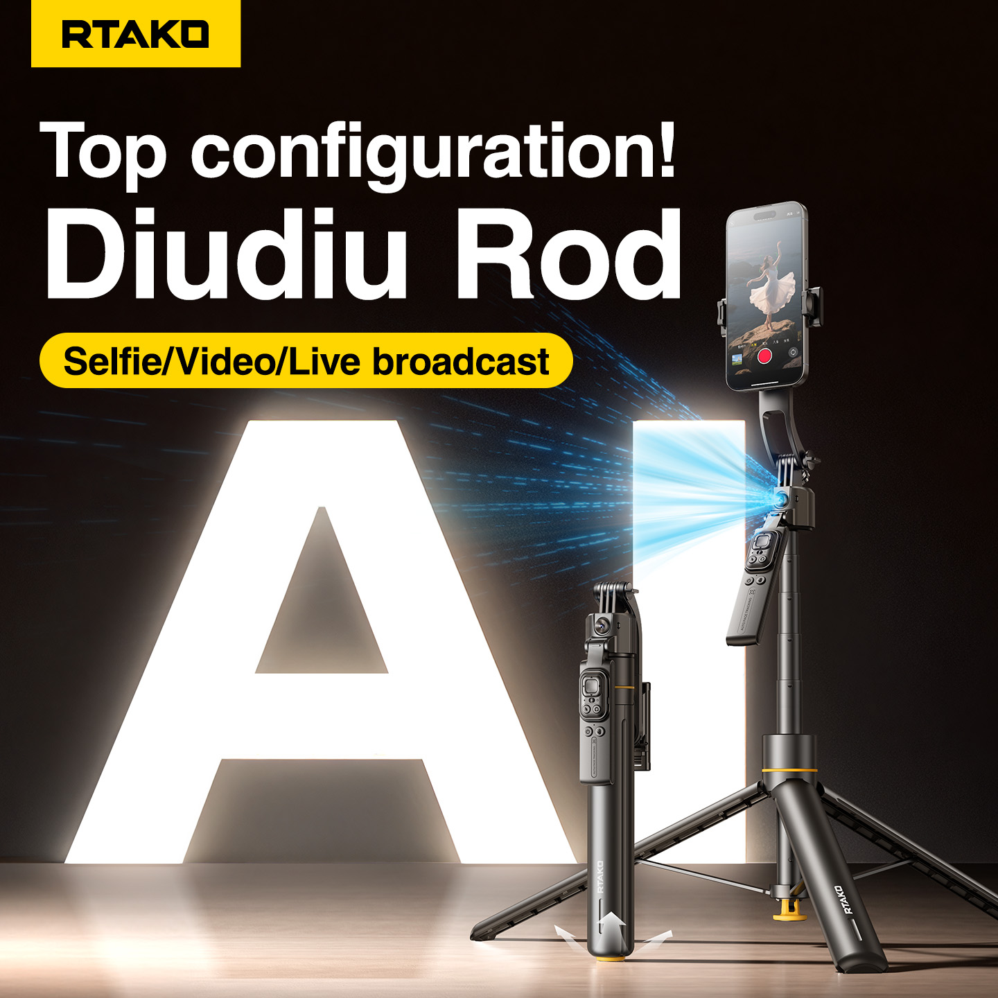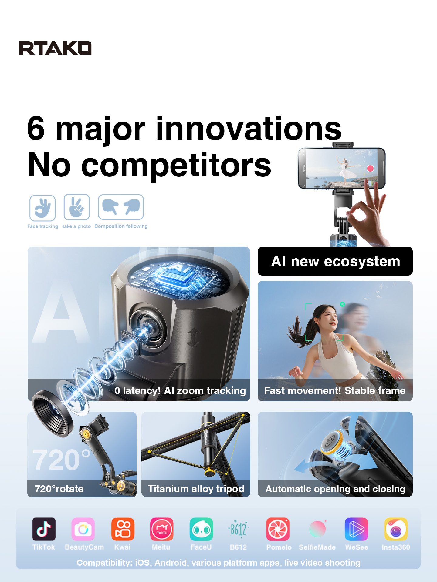 Tính năng Gậy Selfie Tích Hợp Tripod RTAKO TT07 (360° AI face tracking, Douyin remote control, 170cm Extendable pole)